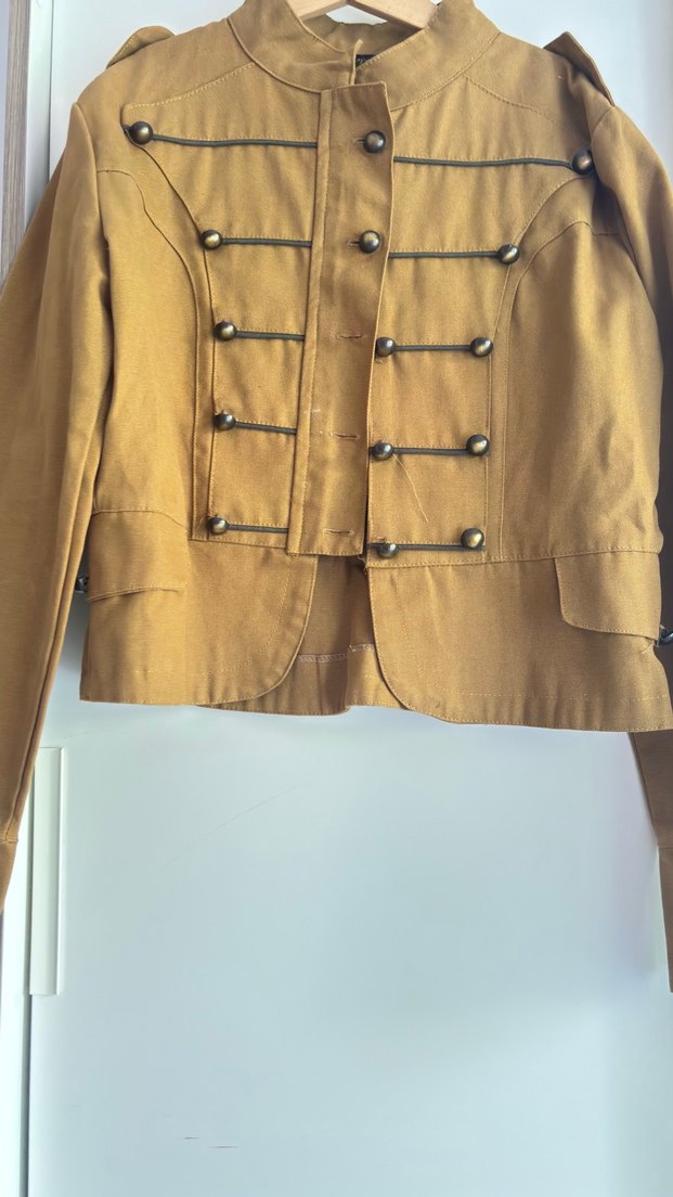 Haki koton kumaştan, düğmeli ve yakası kesik detaylı, parlak görünümlü, midi boy ve ince kesim kadın ceket. Ofis kullanımı için uygun.