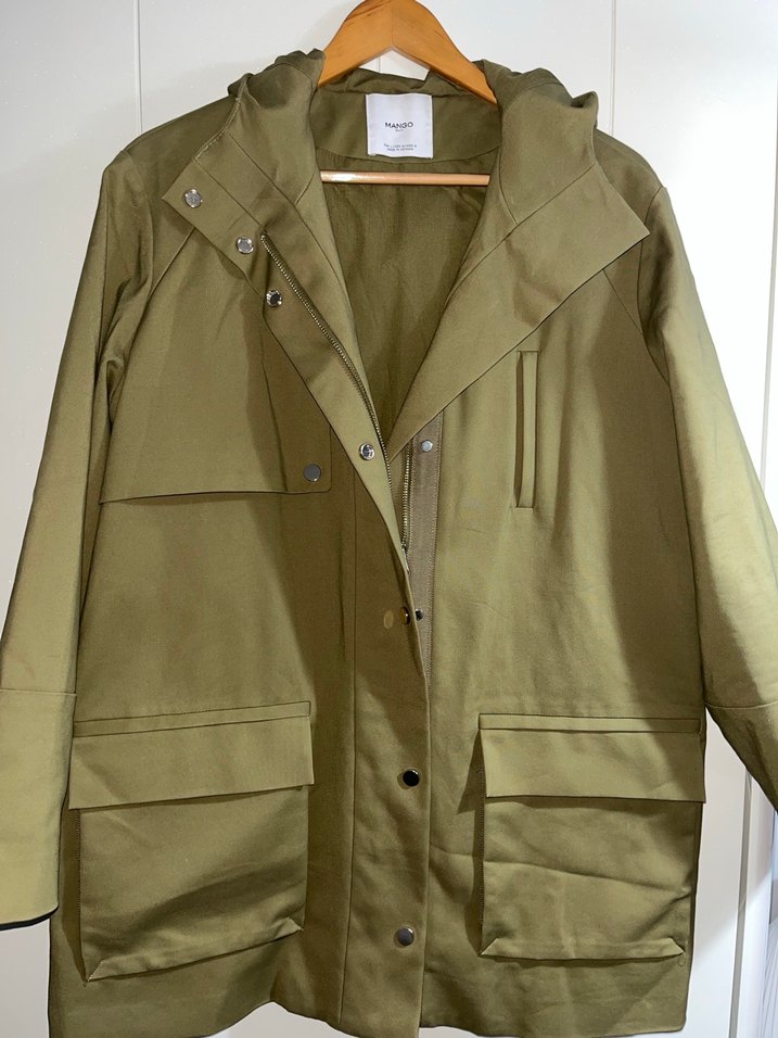 Düğmeli, haki renkli midi ceket regular fit ve kesik yaka ile. Uzun kollu ve parlak dokulu, minimal sokak stili için uygundur.