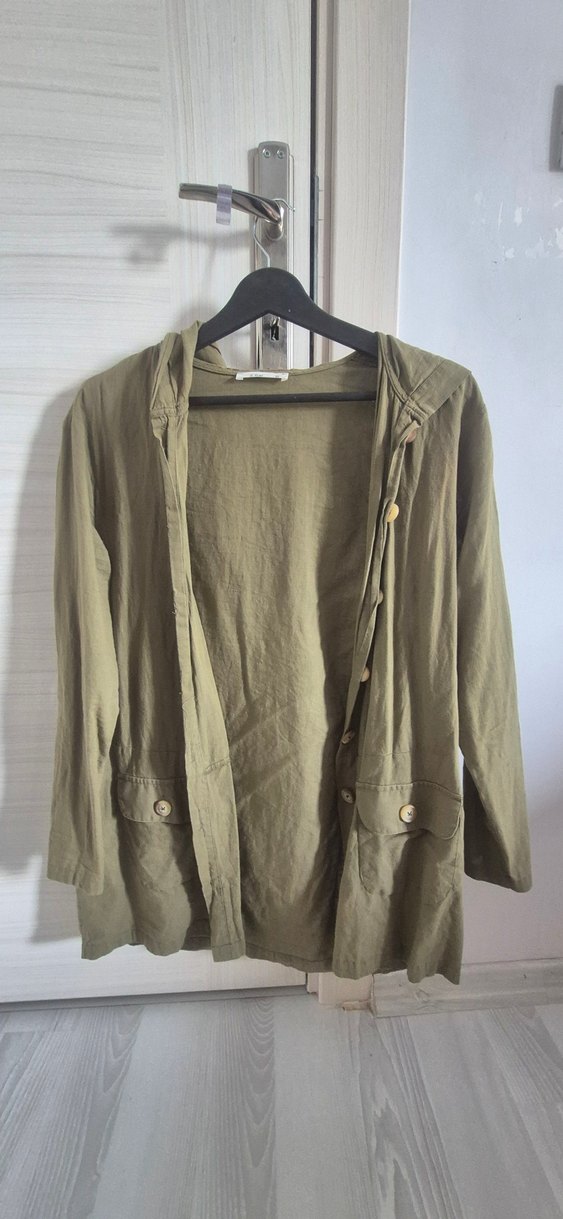 Düğmeli, uzun kollu, notalı yakalı, bol kesim haki ceket, günlük kullanıma uygun.