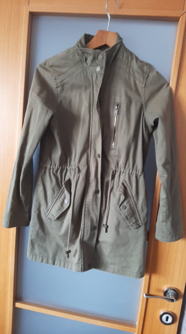 Haki renkte, düğmeli, notched lapel yakalı, uzun kollu kadın ceketi. Midi boyda, bol kesim ve sentetik kumaştan üretilmiştir, günlük rahat sokak tarzı için uygundur.