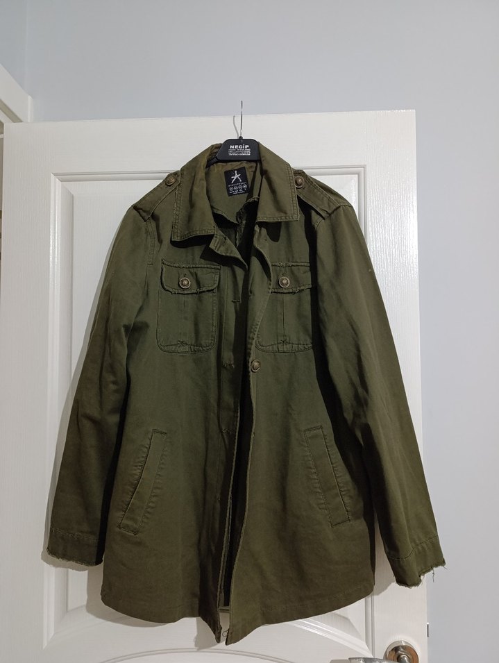 Düğmeli, haki renk keten kumaştan yapılmış, notalı yaka ve uzun kollu midi uzunluğunda rahat kesim kadın ceketi. orjinal ürün