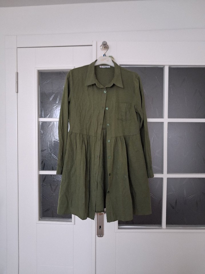 Haki renkte, düğmeli, uzun kollu ve keten kumaştan yapılmış midi ceket. Rahat kesimi ve klasik yakasıyla günlük kullanıma uygundur.