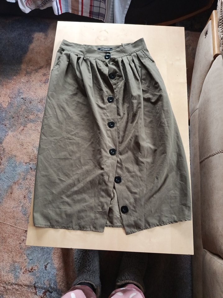 Haki renkte, düğmeli ve bol kesim olan bu midi etek nefes alabilen keten kumaştan üretilmiştir. Basit, bohem tarzı günlük kullanıma uygundur.