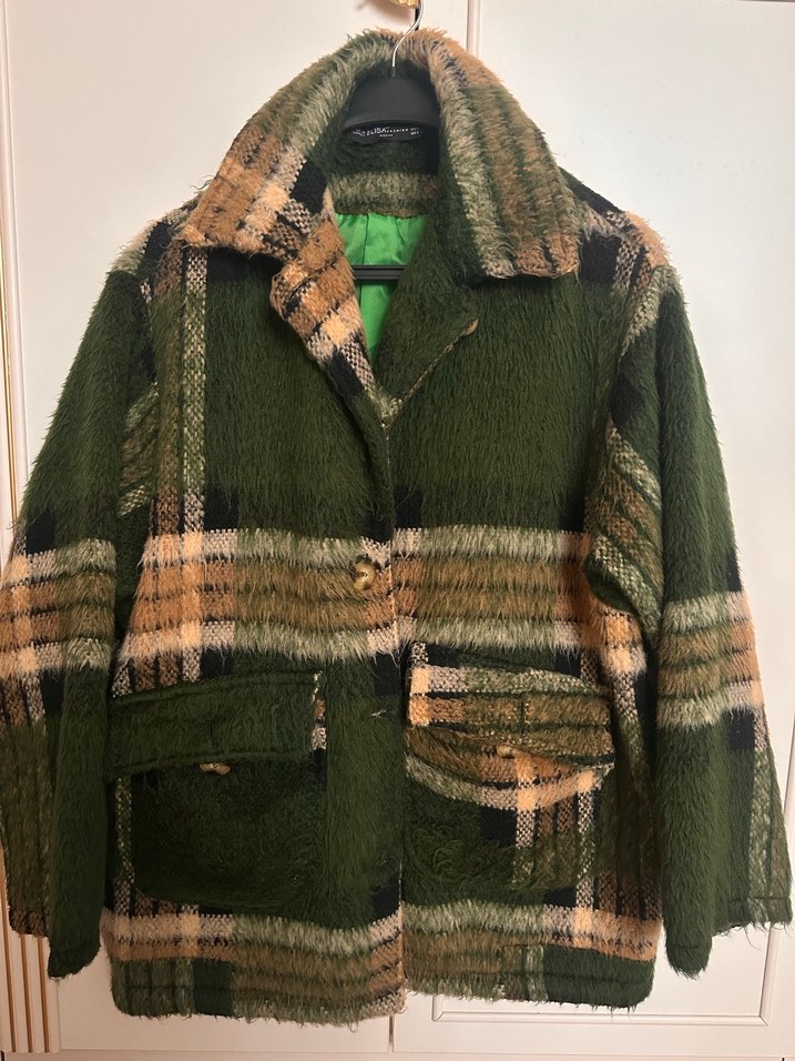 Düğmeli, uzun kollu, yakalı ve yumuşak yün kumaştan yapılmış haki renkli midi uzunlukta bol kesim kadın kaban.