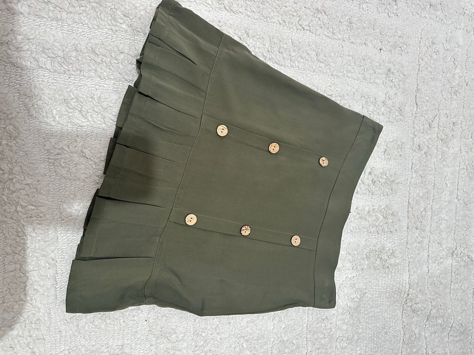 Düğmeli ve pileli etek ucu detaylı, haki renk mini etek. Yumuşak sentetik kumaştan üretilmiş, rahat sokak stili için uygundur.