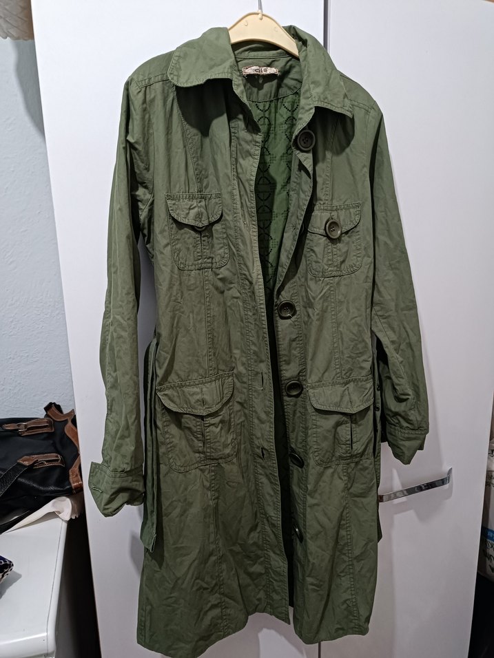 Haki renkli, düğmeli, notched yakalı ve uzun kollu midi uzunluğunda kadın trençkot. Kamuflaj desenli ve günlük sokak stili için uygun. Beden dar kalıp xs-s bedene uygun