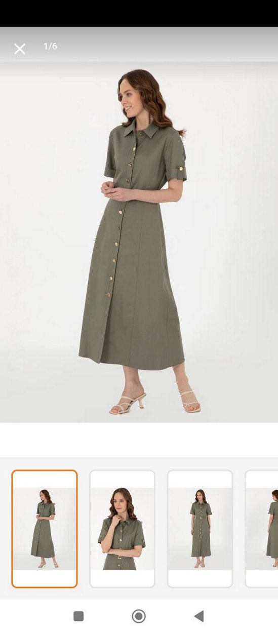 Aldığım gibi yıkayıp ütüledim hiç giyilmedi temiz sorunsuz bir elbise. Düğmeli, kısa kollu, haki renk uzun elbise. Notlu yaka ve düğme detaylarıyla ofis için uygun, sentetik kumaştan rahat kesim.
