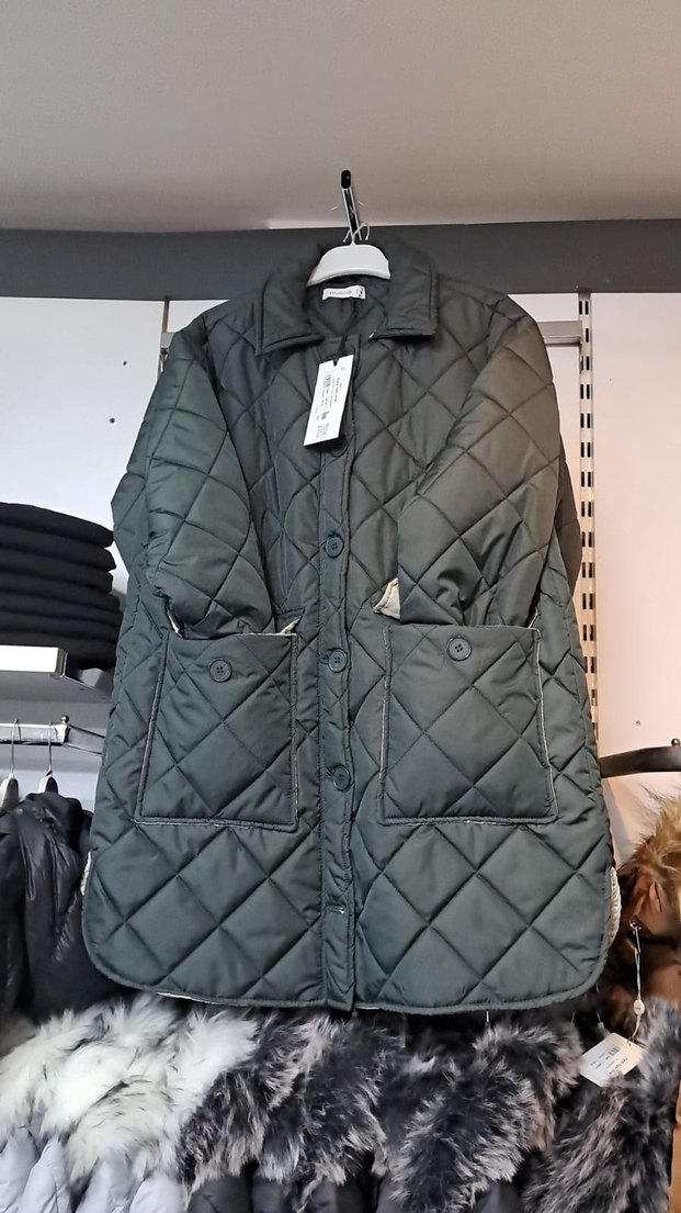 Düğmeli, uzun kollu, haki kadın mont. Gevşek kesim ve kapaklı cepleri ile rahat, sentetik kumaştan üretilmiştir. Sokak stiline uygundur.