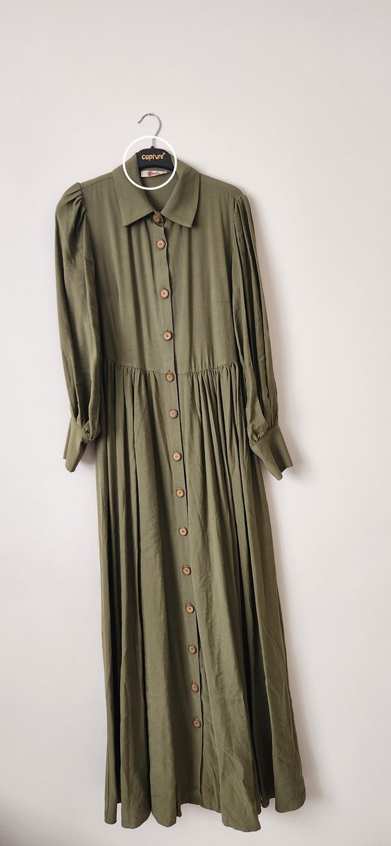 Düğmeli Haki Uzun Keten Elbise