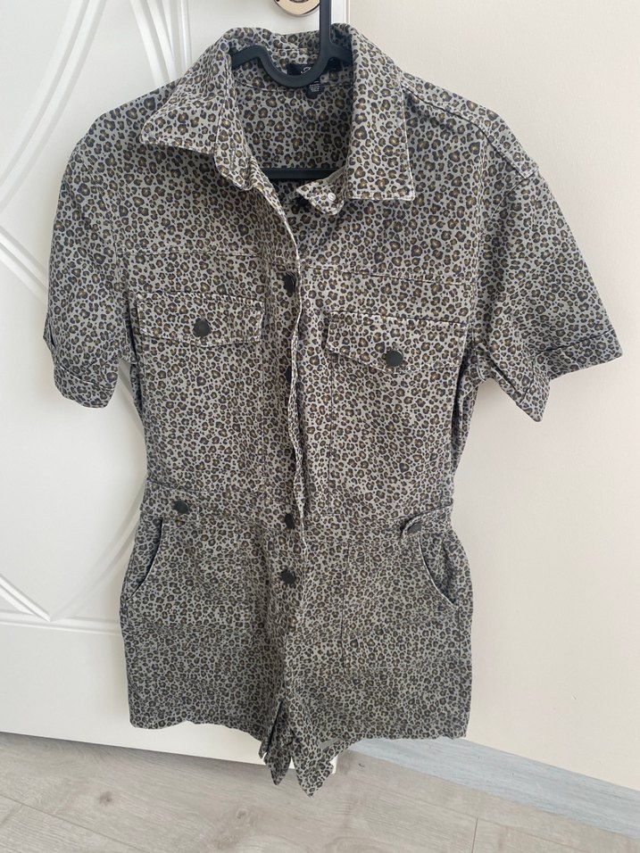 Düğmeli haki ve leopar desen Kadın Kısa Tulum