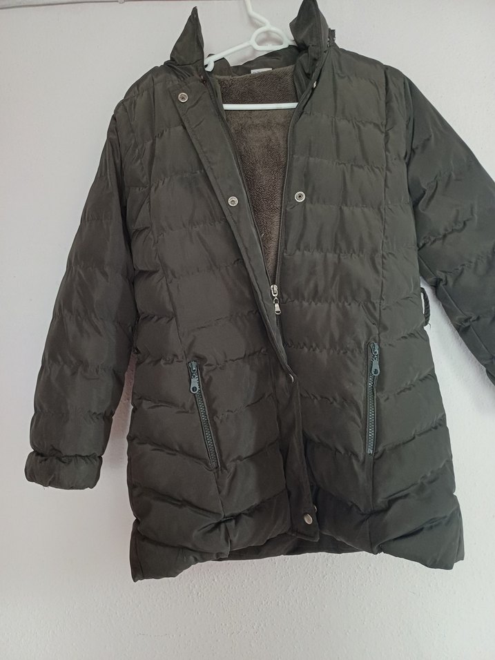 Düğmeli haki yesil mont, uzun kollu ve yumuşak iç yüzeylidir. Notlu yakası ve fermuarlı cepleriyle dış mekan için uygundur.