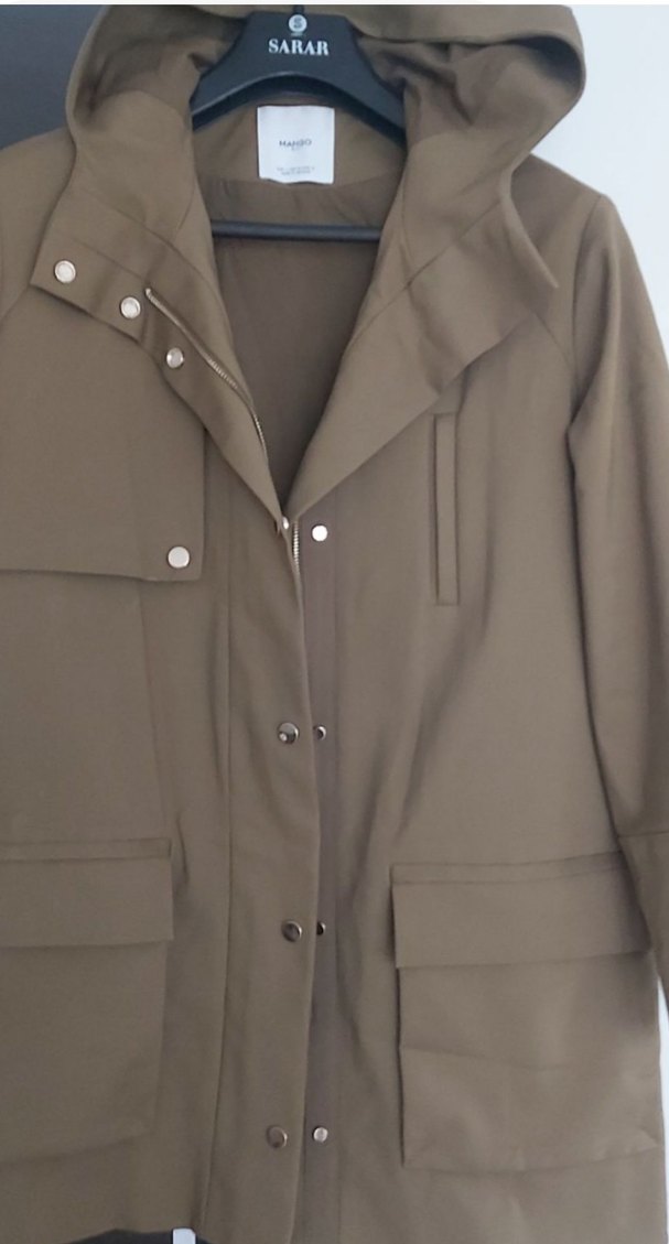 iki defa giyilmiş çok iyi durumda Düğme görünümlü çıt çıt lı, fermuarlı ön kısmı, uzun kollu, haki yeşil,midi uzunluğunda kadın ceketi. pamuklu kumaştan, normal kesim ve sade, minimalist sokak tarzına uygun.