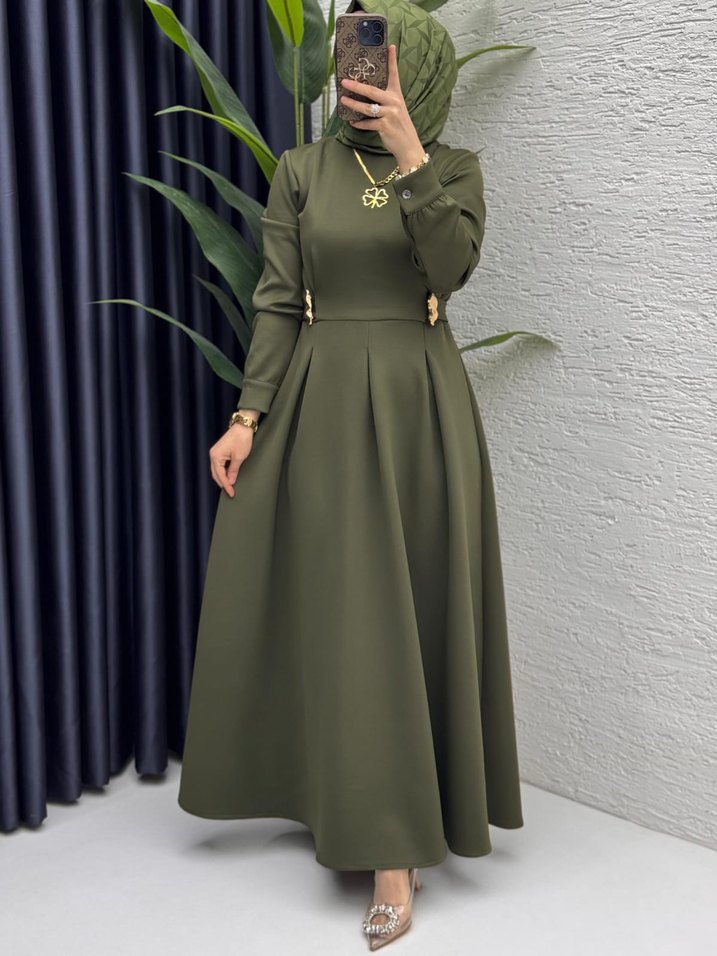 scuba haki yeşil uzun kollu, yüksek yakalı ve işlemeli detaylara sahip düğmeli uzun elbise. Regular kesim ve parlak dokusu ile ofis için uygun. ✨38 bedenden 50 bedene kadar mevcut