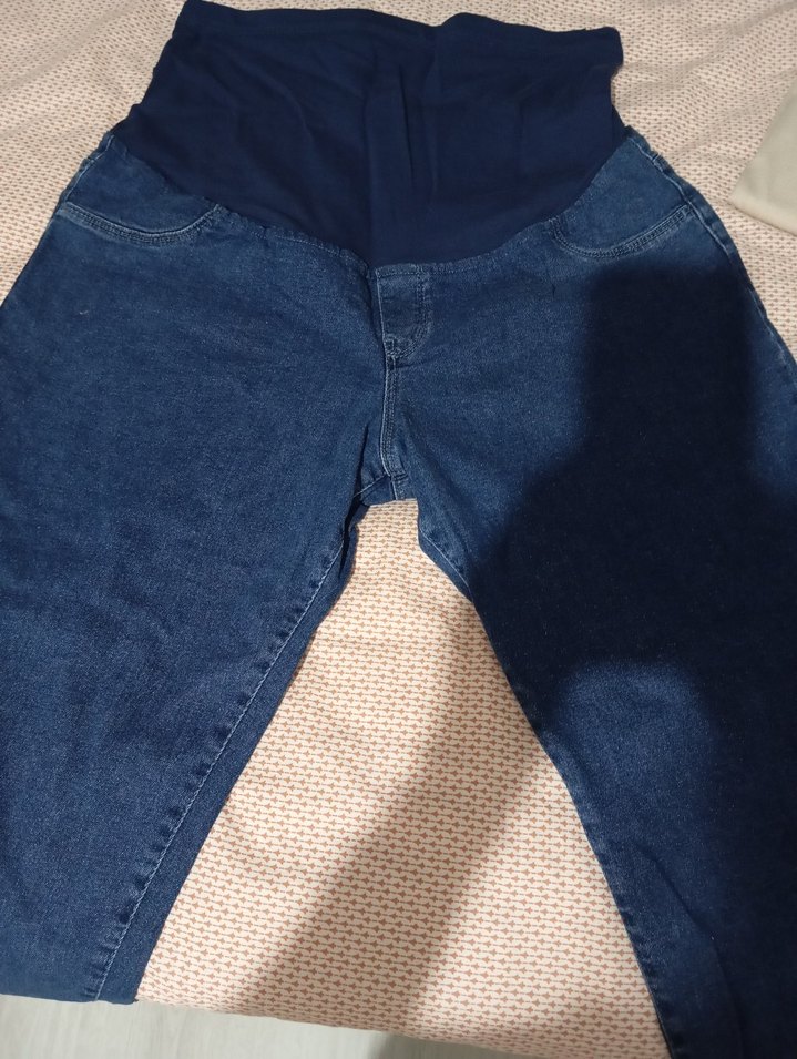 Düğmeli tasarıma ve esnek, yüksek bel bantına sahip dar kesim hamile kot pantolon. Günlük rahat kullanım için uygundur.