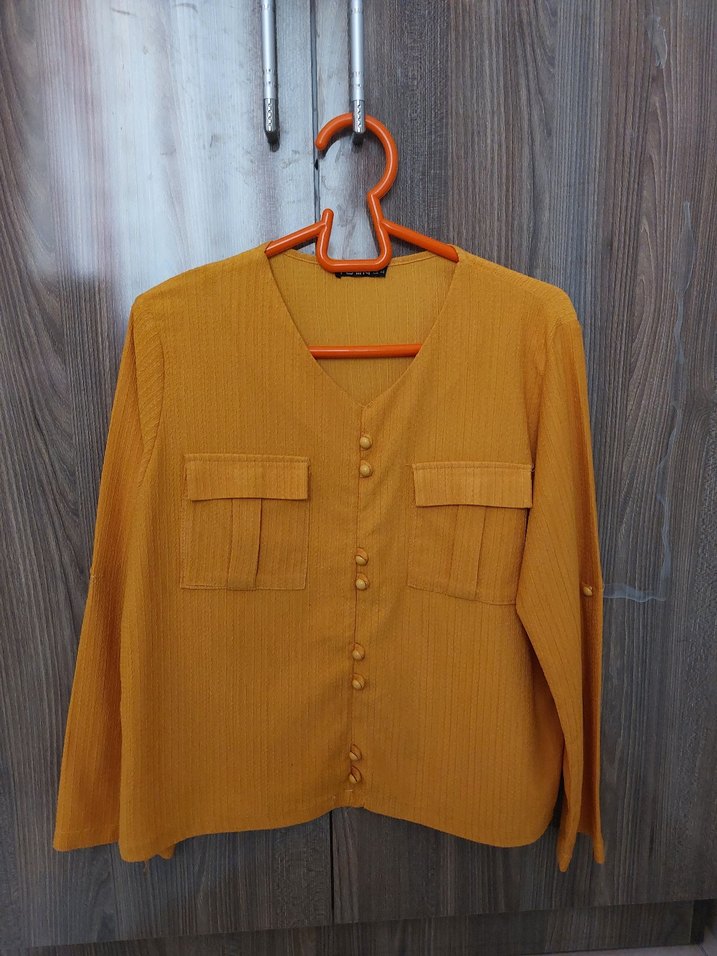 Düğmeli, uzun kollu, V yakalı bluz. M-L uyumludur.