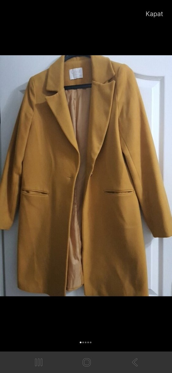Düğmeli, bej renkli parlak süet kumaştan uzun kollu kadın kaban. Minimalist, desen içermeyen ve ofis ile günlük kullanıma uygun regular kesim.