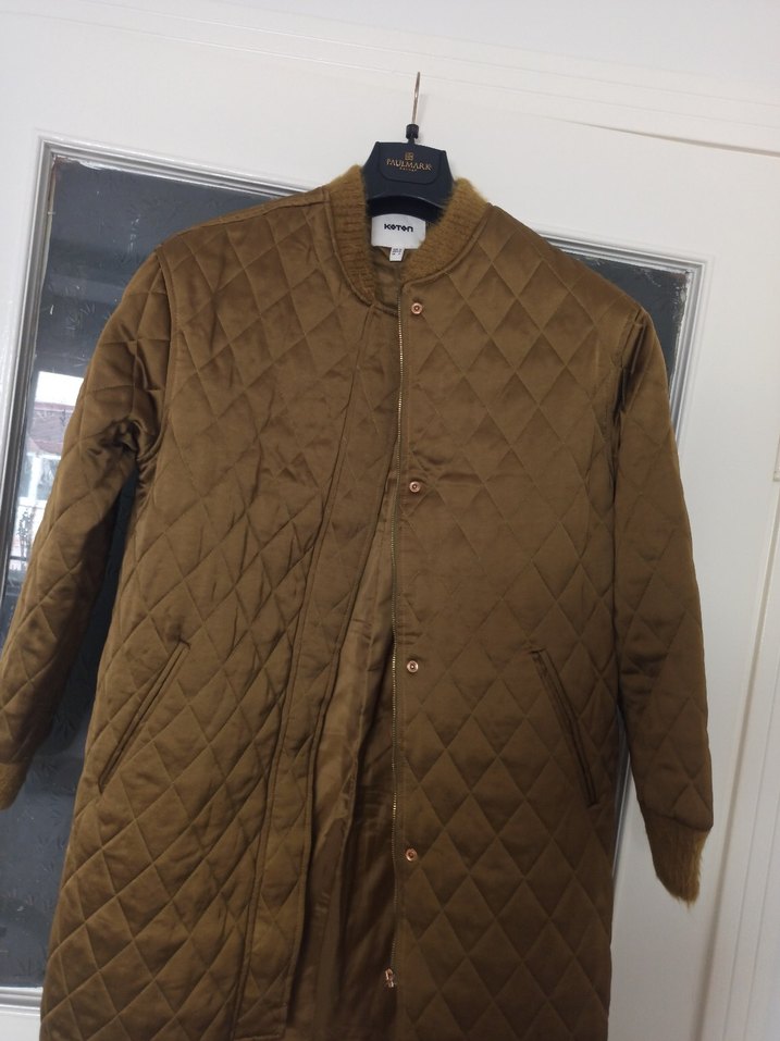 Düğmeli, hardal rengi süet ceket, çıtçıtlı ve kapitone desenli. Uzun kollu, normal kesim ve midi boyda, günlük kullanıma uygun.