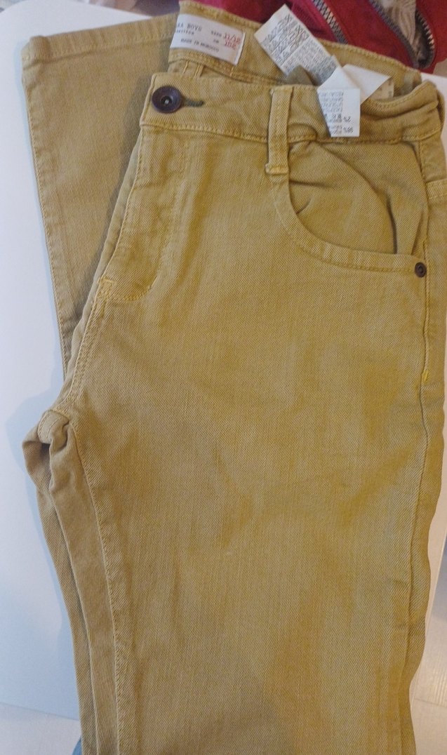 Düğmeli, hardal renkli, keten kumaştan erkek çocuk pantolonu. Bol kesim ve parlak görünümlüdür. Desensiz sade tasarım.