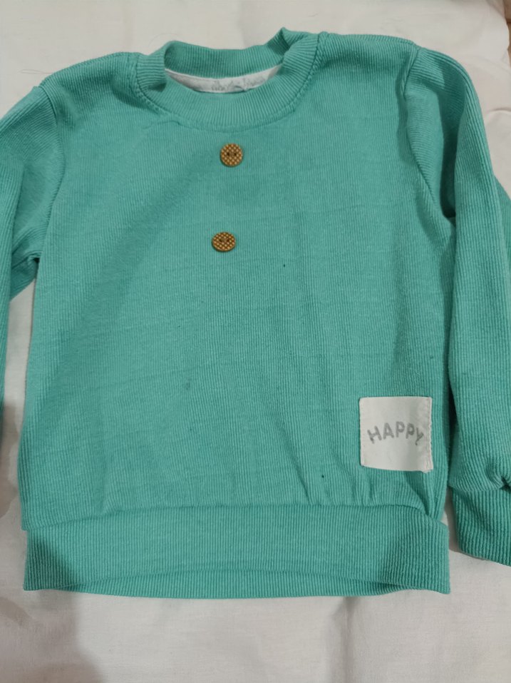 Turkuaz renkli, uzun kollu, yuvarlak yakalı ve bol kesim erkek çocuk sweatshirtü. Önde iki ahşap düğmeli temiz kullanıldı defo vs yok