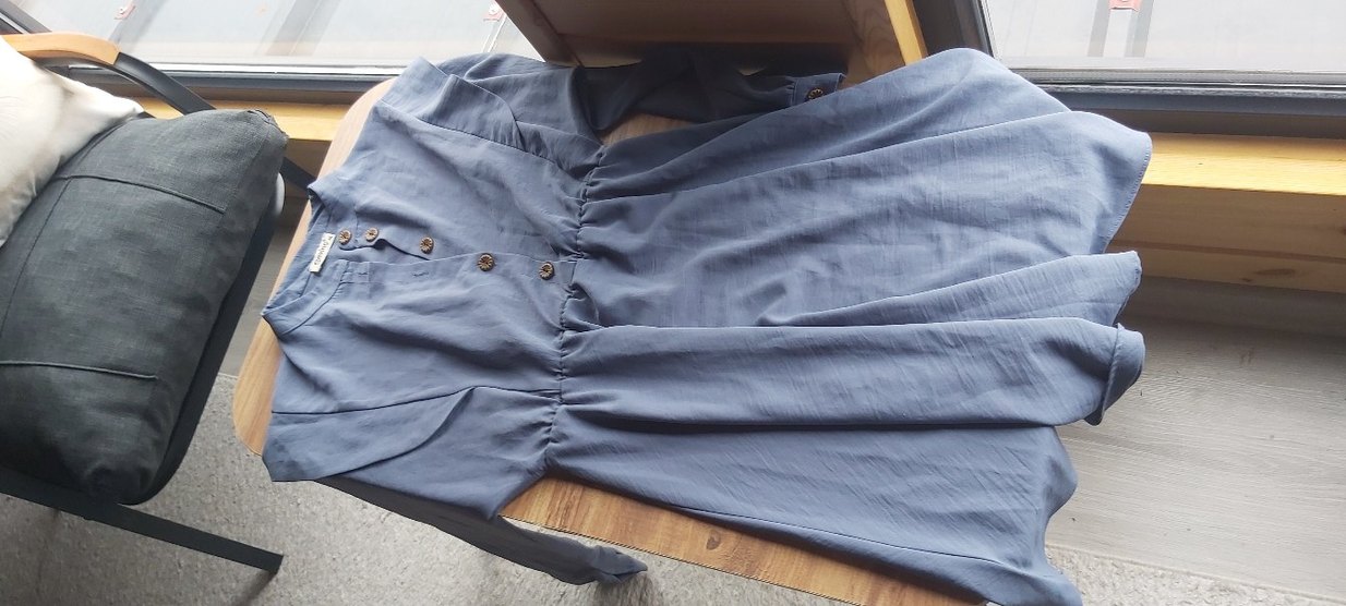 Yumuşak airobin kumaştan, düğmeli ve yakalı uzun kollu, bol kesim indigo hamile tunik. Midi boyda, günlük kullanıma uygundur.
