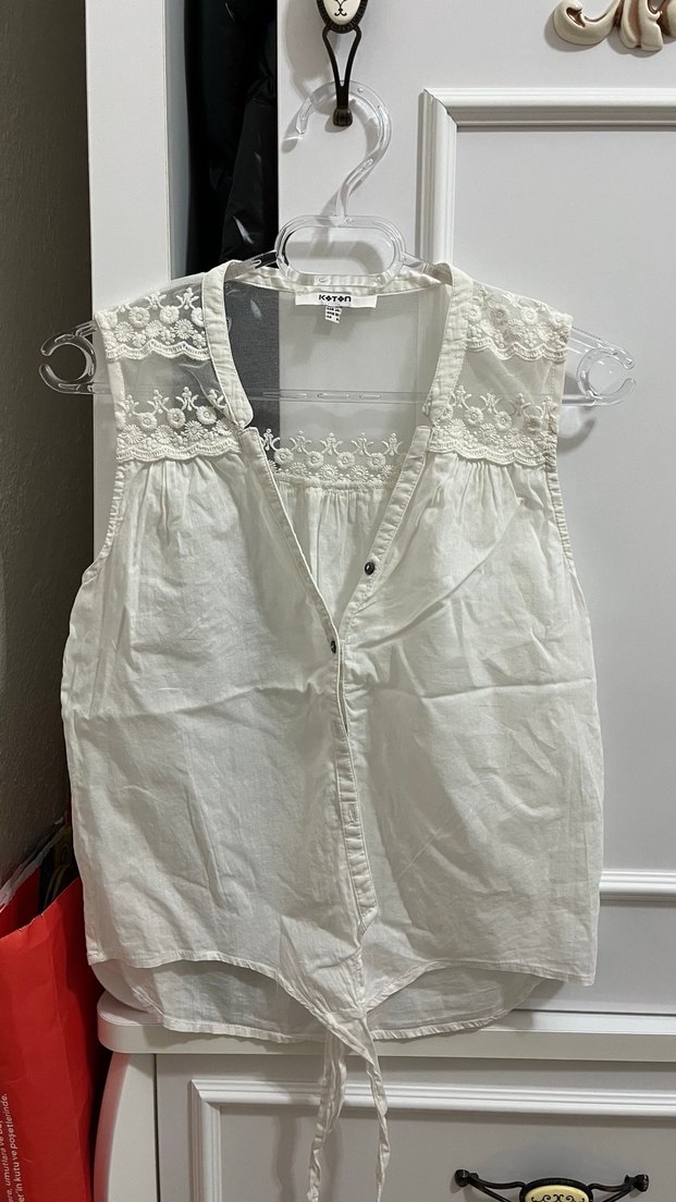 Pamuk kumaştan yapılmış, V yakalı ve işlemeli detaylara sahip kolsuz beyaz bluz. Düğmeli ve bol kesim, günlük kullanıma uygundur.