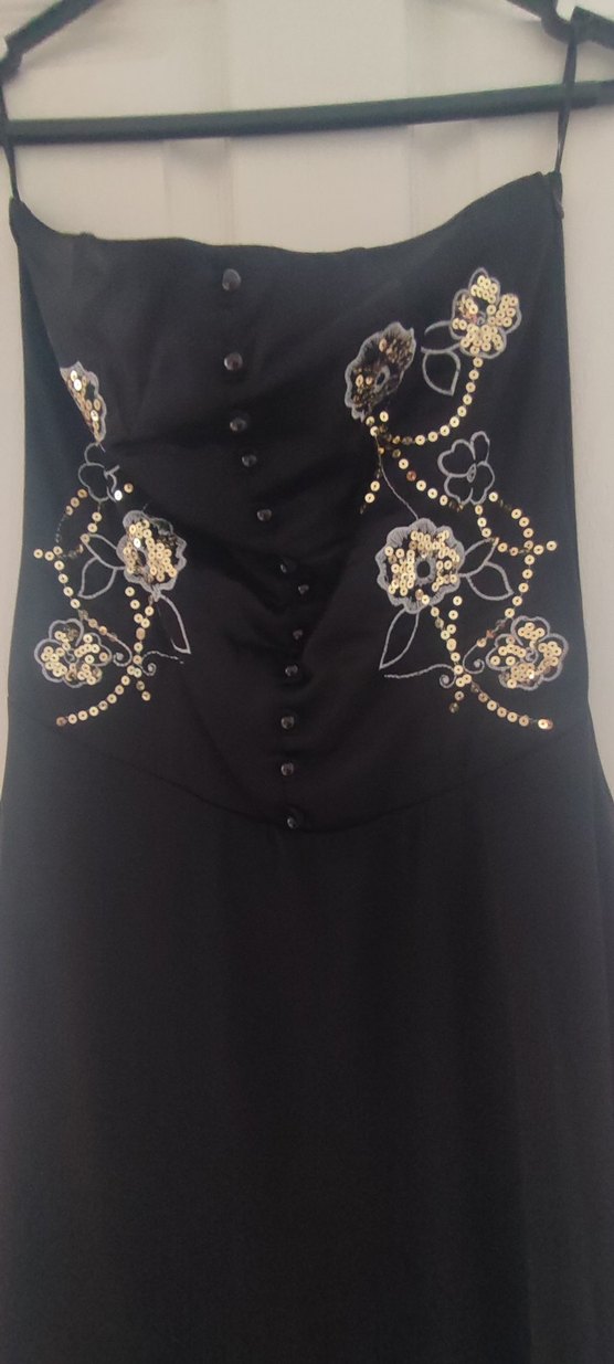 Düğmeli ön kısmı ve straplez 44 beden ancak arkası lastikli ve çapraz ipli olduğu için 42 ve 40 beden kadar uyar. koltuk altından en uzun etek parçasına kadar 127 cm midi boy. dore altın pul işlemeli.