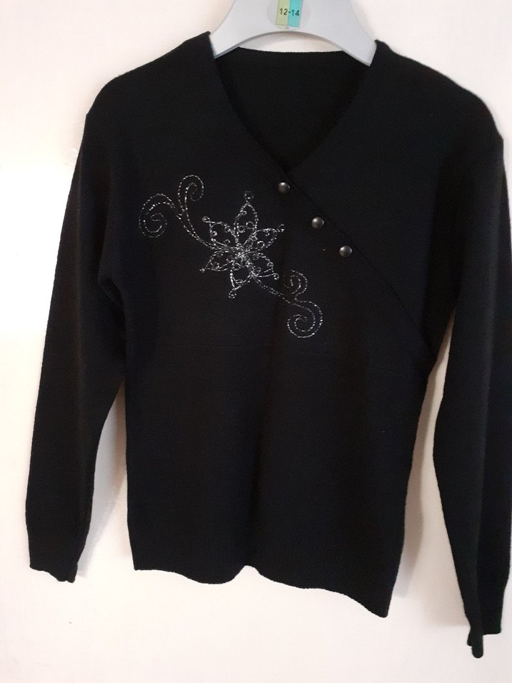Siyah triko kazak, V yaka, uzun kollu, düğmeli ve işlemeli detaylara sahiptir. Salaş kesim ve midi boyda, günlük kullanım için uygundur. en 40cm boy 55cm hiç kullanmamis. beden yazmiyor olculere göre alin. tahmin S M