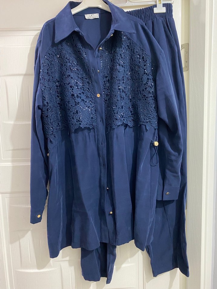 Uzun, düğmeli ve işlemeli mavi kadın takımı, bol kesim ve yakalı. İpeksi kumaş ve uzun kollu, bohem Paris tarzında günlük kullanıma uygun. Çok şık 1 kez giyildi yeniden farksız 46 bedene kadar olur