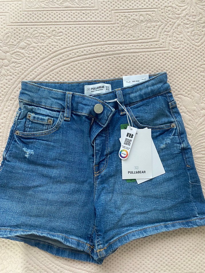 Düğmeli ön kısmı ve mavi-gri tonlarda baskılı tasarımıyla, günlük kullanıma uygun, dar kesim jean mini şort. Marka: Pull&Bear.