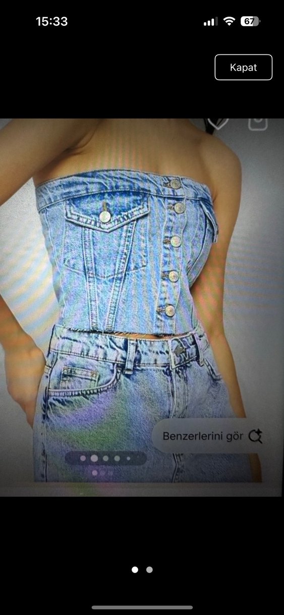 Düğmeli, straplez yakalı ve kolsuz bu bustiyer, pastel mavi denim kumaştan kısa boyda ve vücuda oturan kesimdedir. Günlük, trend tarzlara uygundur.