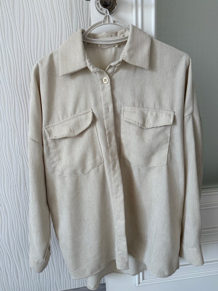 Bej kadife kadın gömlek, kesik yaka ve uzun kolludur. Düğmeli, bol kesim ve iki ön cep ile günlük kullanım için uygundur. Tertemiz