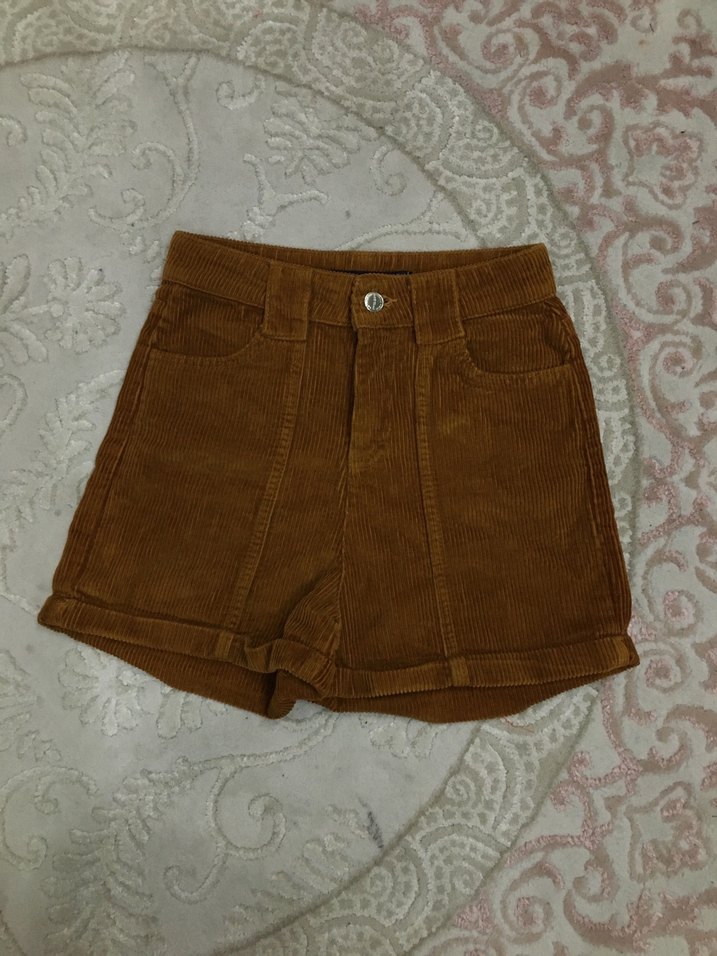 Düğmeli, kahverengi fitilli kadife kumaştan yapılmış bol kesim kadın şortu, desen içermeyen sade tasarım, sokak modasına uygun. Marka tarz bir ürün