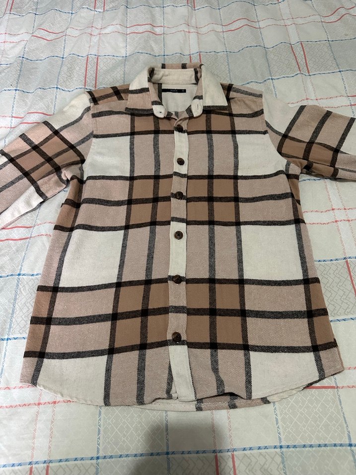 Kadınlar için düğmeli, uzun kollu, yakalı, bol kesim ve midi boyda bej kareli gömlek. Rahat sokak stili için uygun.