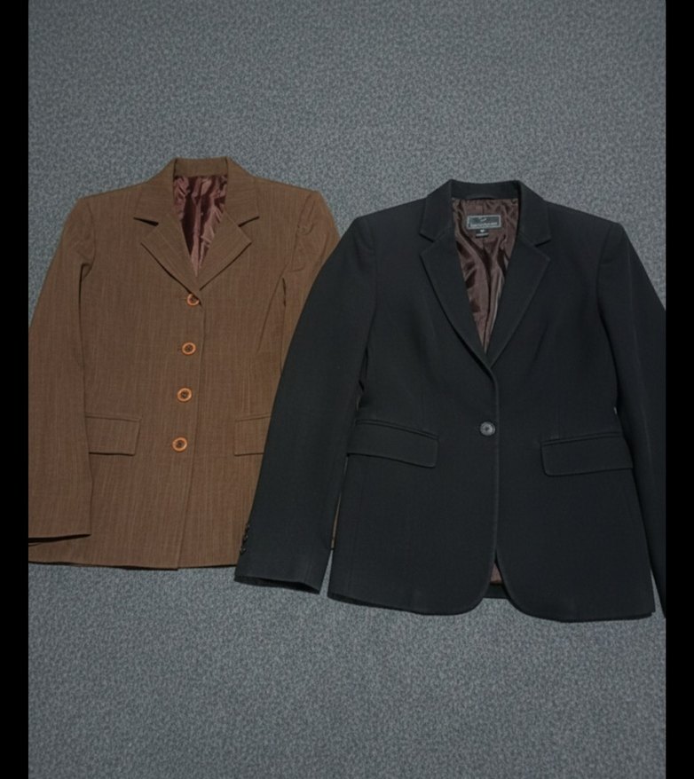 Düğmeli, uzun kollu kadın blazerlar, normal kesim ve midi boyda. Sentetik kumaştan, kahverengi ve siyah renklerde, düz desensiz. Ofis için uygun, trend casual tarzda. Siyah olan Fransa'dan Daniel Hecter marka. Kahve olan da Türkiye'den alındı markası da Milhan. İkisinin fiyati