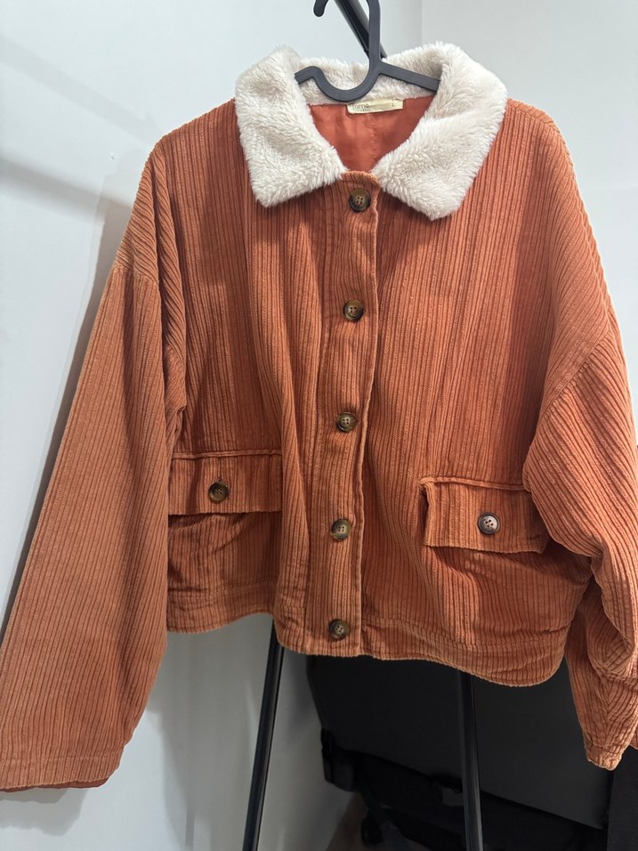 Bu ceket, yumuşak ve sıcak dokulu yakalı, uzun kollu ve bol kesimdir. Parlak görünümlü, düğmeli kapamalıdır ve rahat sokak stiline uygundur.