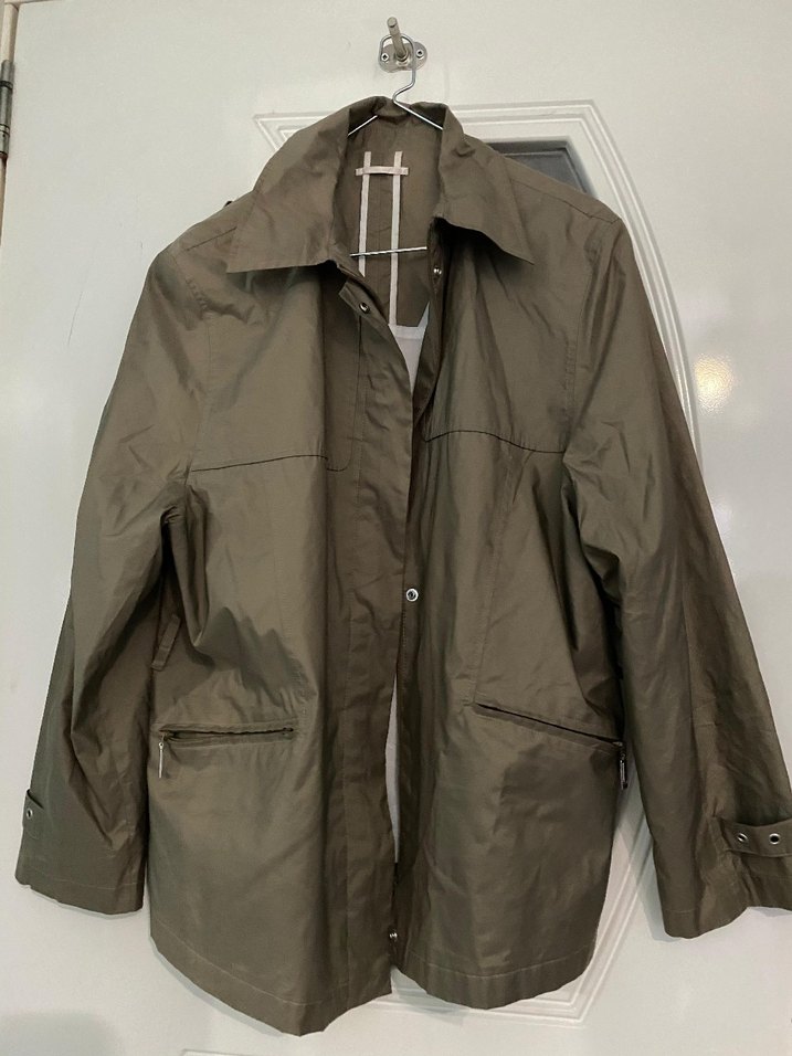 kahverengi renkli keten kumaştan, düğmeli ve kısa boy midi uzunluğunda, notched lapel yakalı, bol kesim kadın ceket( yağmurluk) içi astarlı kemeri kayıp sadece .hiç giyilmedi