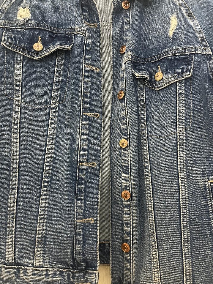 yakalı ve strappy kollu kadın denim ceketi. Orta uzunlukta, sokak stiline uygun, sıkı kesim. xs ama s ve M de rahat olur.