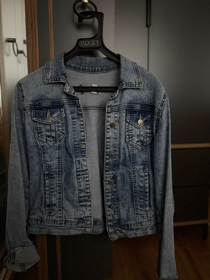 Düğmeli, uzun kollu, mavi renk ve normal boy kadın denim ceket. Notched lapel yakalı, fitted kesim ve günlük kullanıma uygun sokak stili.