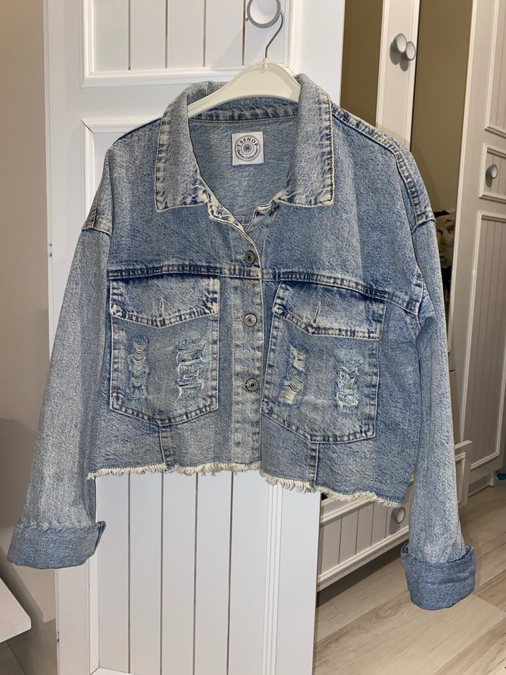Kadın denim ceket, düğmeli, uzun kollu ve kesimli yaka detayına sahip. Bol kesim ve midi boyda, günlük sokak stili için uygun.