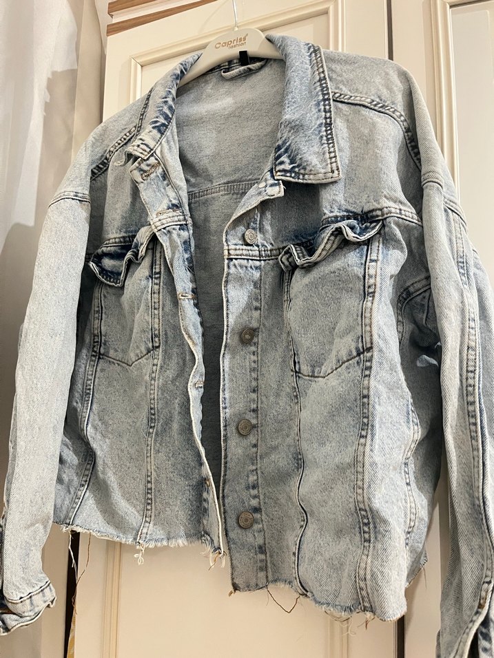 renkte, düğmeli, uzun kollu, notched lapel yakalı, bol kesim kadın denim ceket. Günlük kullanıma uygun rahat bir sokak stili sunar.