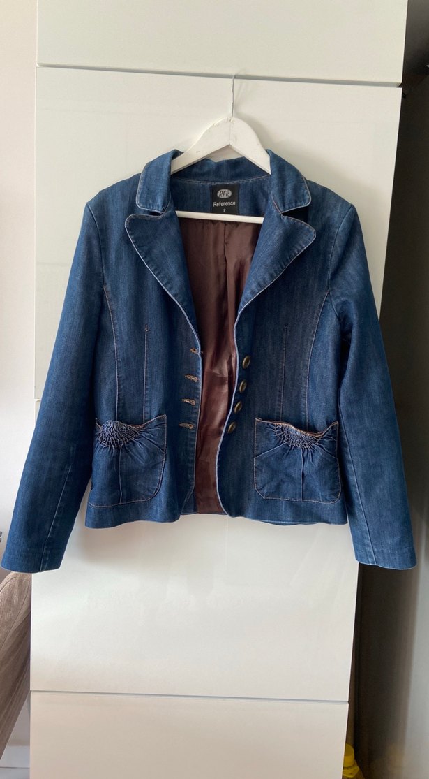 Koyu mavi renkte, düğmeli ve yakalı kadın denim kot ceket. Uzun kollu, normal kesim ve ceplerde detaylı işlemeler bulunur. Ofis kullanımı için uygundur. M/L uygundur Sorunsuz bir iki defa kullanılmıştır Beden değişikliği nedeniyle satışa koyulmuştur iade yoktur Ölçüleri mevcut fotoğraflarda