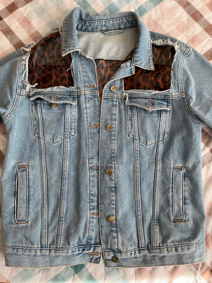 Düğmeli, uzun kollu, bol kesim denim ceket, omuzlarda leopar desen detaylı, kesikli yaka ile.