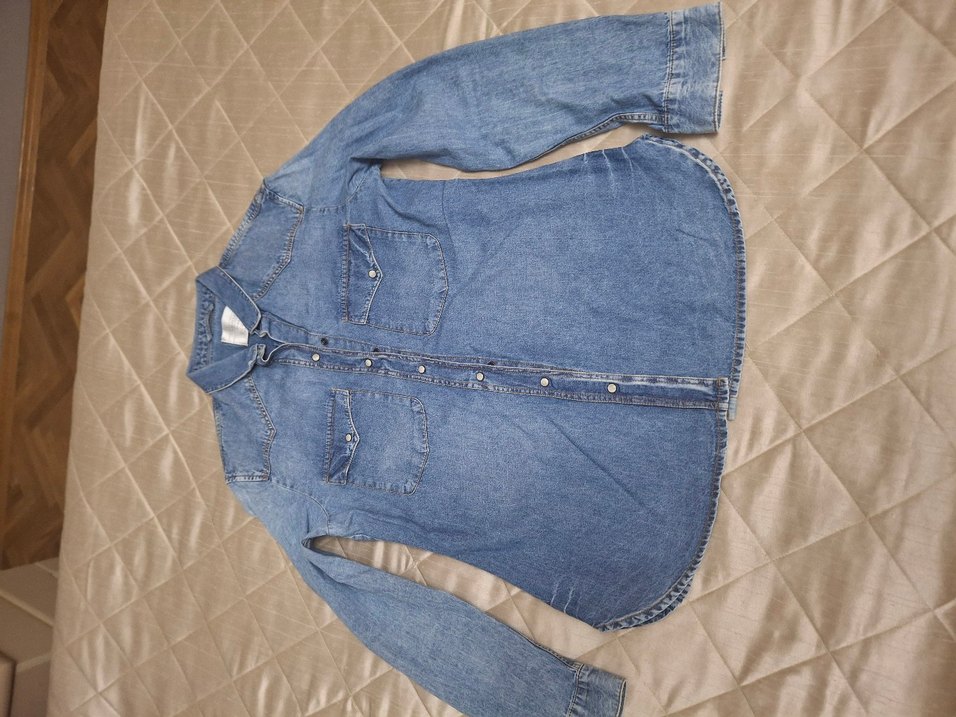 Düğmeli, yakalı ve uzun kollu kadın denim ceket. Normal midi boyda, desen içermeyen mavi-gri tonlarda günlük sokak stilinde.