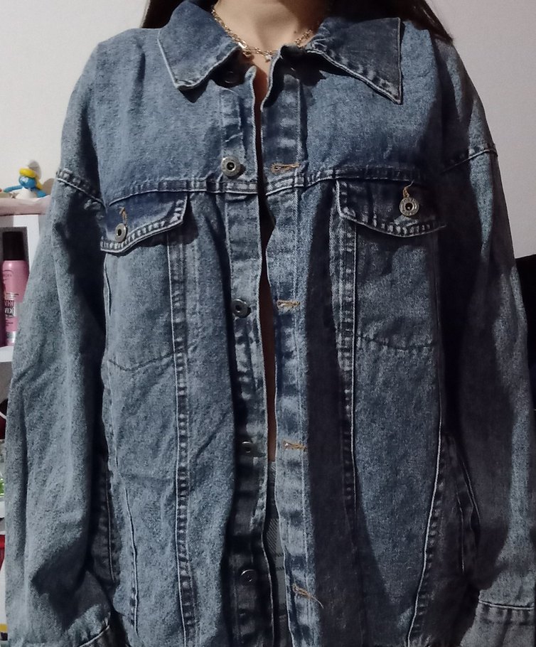 düğmeli, notched lapel yakalı, bol kesim ve uzun kollu midi boy kadın denim kot cekettir.