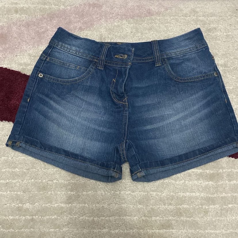 Mavi tonlarda düğmeli, bol kesim kız denim şort. Yurt dışından alındı hiç giymedim beli bol geldi pense yaptırdım ama yine de giymedim. Alan kişi işin belimi sökeceğim beli açılırsa 72 cm civarı oluyor.