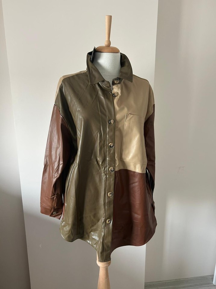 Düğmeli, parlak renk bloklu kadın deri ceket. Uzun kollu, yaka detaylı ve midi boy, bol kesimdir. Sokak modasına uygun şık bir parça.