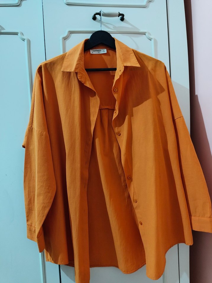 Düğmeli, uzun kollu, notched lapel yakalı, parlak keten kumaştan, bol kesim camel renk kadın gömleği. Normal midi boyda, minimalist tarzda günlük kullanım için uygun.