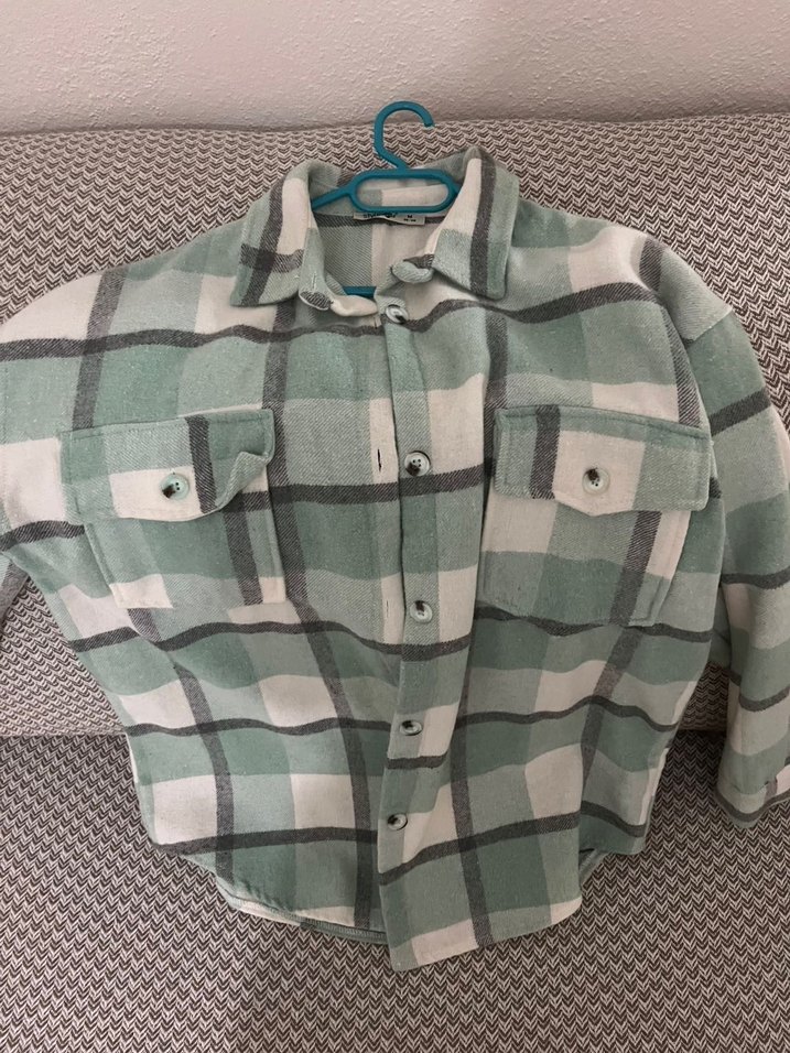 Düğmeli, uzun kollu, yesil kareli desenli, rahat kesim kadın gömleği. Notlu yaka ve günlük sokak stili için uygundur. az giyildi