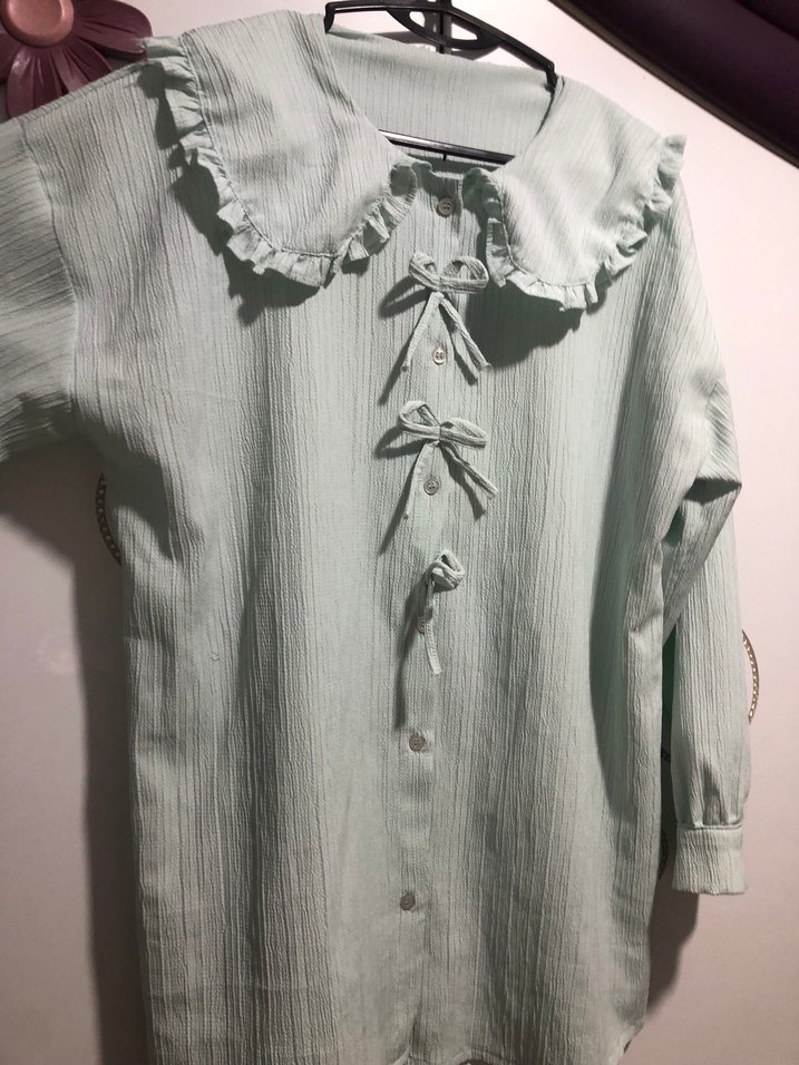 Uzun kollu, fırfırlı yakalı ve fiyonk detaylı düğmeli gömlek. Salaş kesim ve midi boyda, günlük kullanıma uygun.