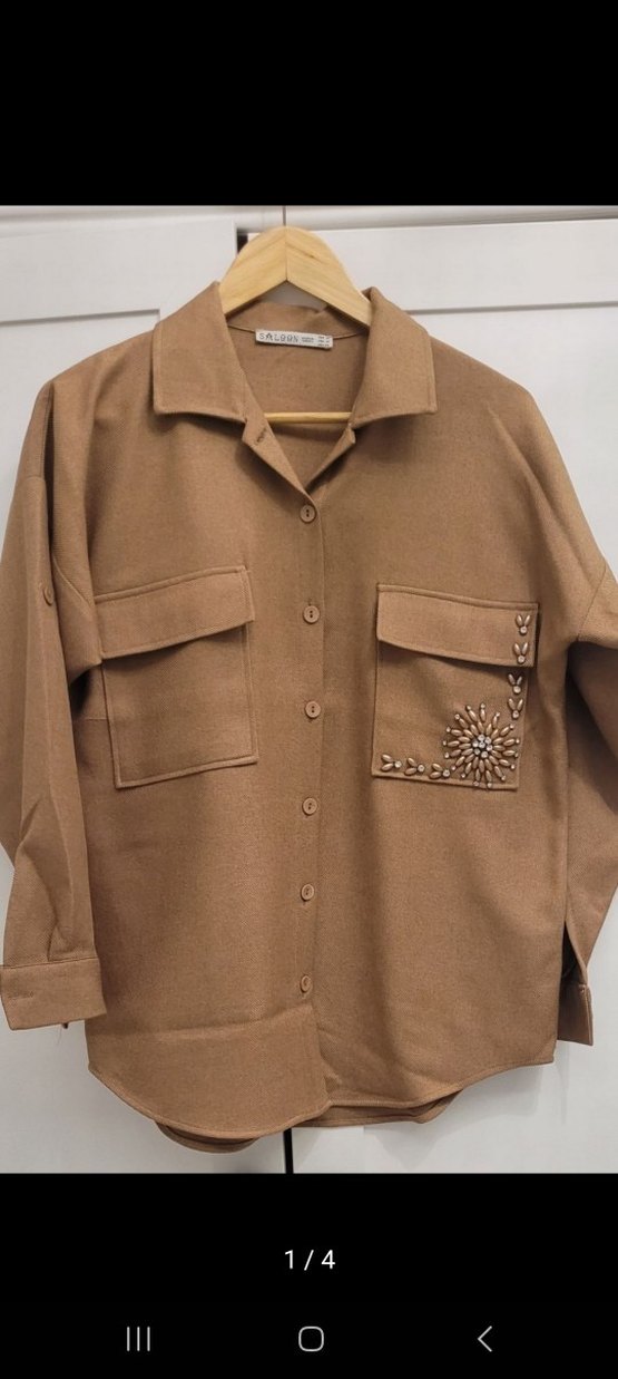 Düğmeli, uzun kollu kahverengi süet gömlek, kesik yaka ve bol kesim özelliklerine sahiptir. Nakışlı parlak detaylar bir cepte yer alır, günlük rahat sokak stili için uygundur. az kullanıldı